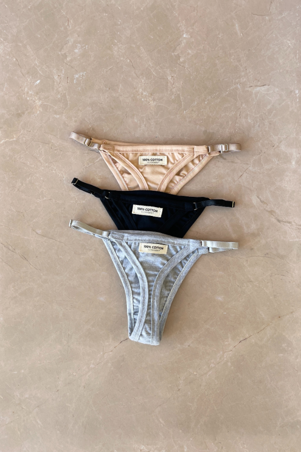 Es la tanguita clasica regulable, podes elegir avíos plásticos (correderas, arandelas)